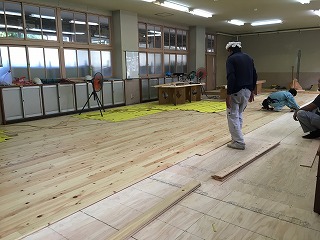 | ☆8月6日(日) ○体育館の耐震工事が終了しました。 ・体育館の工事は7月31日に終了し、使えるようになりました。 【LED照明になりました】 ・以前の照明より明るくなりました。 【バスケットゴールのつり下げ部分補強】 ○職員室の床改修工事は進行中です。 ・暑い中、改修工事が進められています。 ★8月1日(火) 【8/1;床の板が全て取り除かれました】 【8/1;職員室入り口】 【8/1;取り除かれた板など】 ★8月2日(水) 【8/2;職員室の後方】 ・骨組みの上にベニヤ板を張っていました。 ★8月4日(金) 【8/4;床板の設置】 ・ベニヤ板の上に床板を張っていました。 【8/4;床がどんどんきれいになっていました】 |