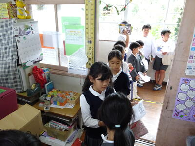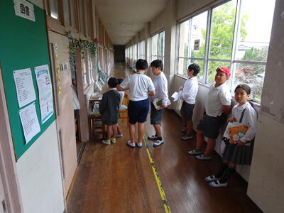 翌日の今日は、早速たくさんの本を借りたようで、返却に来ていました。図書室前の廊下は普段見られない行列でした。