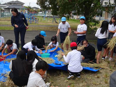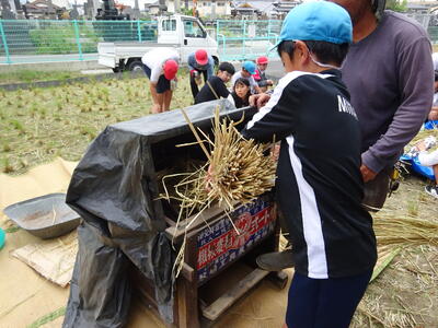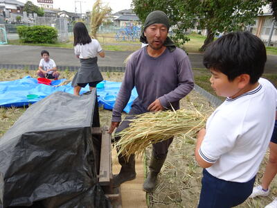 5日(金)に5年生児童が脱穀作業体験をしました。