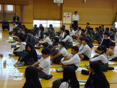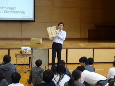 11月7日(金)に肥後銀行八代支店からお越しいただき、5・6年生を対象に金融教育を行いました。学習指導要領改訂により、学校での金融教育が義務化された事を機に、本校では、金融機関の方を招いて話を聴くことによって知識がより深まることを期待して実施しました。