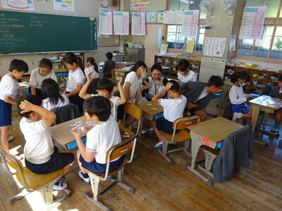 2年1組と2組は算数のかけ算九九のカードを使って楽しく勉強していました。