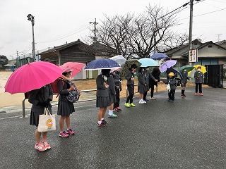 | ☆平成30年2月1日(木) ・6校時に、2月の委員会活動をしました。 【環境ISO委員会】 ・プランターの桜草を、花壇に植え替えました。 ・体育館2階の整理整頓をしました。 【保健委員会】 ・現在取り組んでいる「お茶うがい」について話し合いをしていました。 【図書委員会】 ・図書室の飾り作りをしていました。 【運営委員会】 ・2月の児童集会の内容について話し合っていました。 【給食委員会】 ・1月の反省と2月の目標決めをしていました。 【ハートフル委員会】 ・2月の取組について話し合っていました。 【情報委員会】 ・掲示物の張り替えをしていました。 〇毎週木曜日は、「あいさつ運動」です ・朝から雨でした。傘をさしてのあいさつ運動でした。 【南門でのあいさつ運動】 |