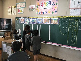 | ☆平成30年2月3日(土) ・2月2日(金)、2年2組の村上先生が研究授業をしました。(フライデーゼミナールです) 【国語「三枚のおふだ」の授業】 ・はじめに、教科書「三枚のおふだ」の読み聞かせを聞きました。 【おもしろかったところはどこかな?】 ・挿絵を見ながら、一人一人ていねいに短冊に書きました。 【黒板に貼りました】 ・挿絵の下に、自分の短冊を貼りました。「友達はどこがおもしろいと思ったのかなあ。」 ・短冊を貼った後、おもしろいと思ったところを発表しました。 ★若手教師のスキルアップチャレンジ授業として、八代市教育委員会の指導主事、加賀先生にも授業を見ていただきました。 |