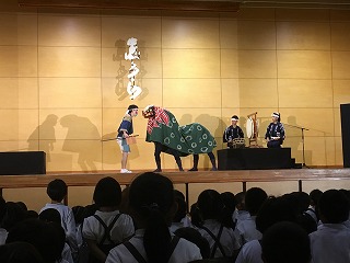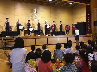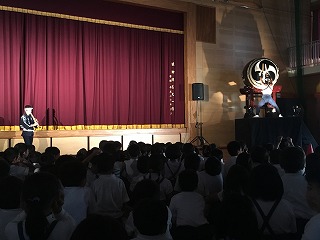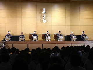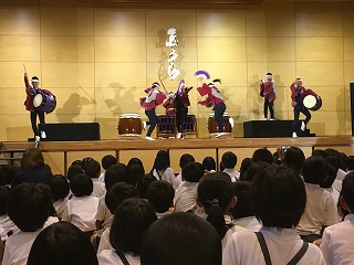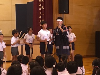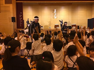 | ☆6月14日(水) 〇和太鼓「志多ら(しだら)」の公演がありました ・文化庁主催の巡回公演で、昨年度(H28は能楽でした)に引き続き、本校体育館で行われました。 【和太鼓集団『志多ら』のみなさん】 ・1989年愛知県にて結成されました。 ・「志多ら」の語源は、平安時代、農民たちの間で広く信仰された神、志多神(設楽)神より名付けられたそうです。 【校長先生のあいさつ】 【保護者、地域の方、保育園など多くの参加者でした】 ・テレビ局や新聞社の方も来ていました。 ♪1曲目「神馬」 ♪2曲目「明神山」 ♪3曲目「獅子」 【獅子と飛脚のコミカルな寸劇に合わせて演奏】 ↓↓↓↓ 【会場が笑いの渦につつまれました】 ♪4曲目「たたこうコーナー(太鼓の体験)」 【太鼓をたたきたい子は挙手。たくさんの希望者がいました】 【20名ほどが様々な太鼓をたたく体験をしました】 【太鼓体験の感想】 ・6年男児「初めてたたきました。想像以上に音が大きかったです。」 ♪5曲目「尺八演奏」、6曲目「大太鼓」 【尺八と大太鼓の共演】 ・風がそよぐような尺八の音色と、稲妻が轟くような大太鼓の音。体全体で感じました。 ♪7曲目「屋台ばやし」 ♪8曲目「花まつり志多ら舞」 【楽しく踊りながらの演奏】 【ワークショップで覚えた踊りを一緒に踊りました】 ・1~3年生は手を左右に振りながら、4~6年生はうちわを持って、曲に合わせて踊りました。 ♪アンコーーール!!! 【会場全体スタンディングでダンスダンスダンス!】 ♪お礼の言葉 【運営委員の6年児童】 ・「志多ら」のみなさん、はるばる九州の熊本までおいでくださり、素敵な公演をありがとうございました。 ★植柳を発ち、明日は佐賀県の中学校で公演 【4tトラックに太鼓や機材を乗せ日本各地で公演】 ・これからも、和太鼓の演奏をとおして、子どもたちの豊かな心を育てられてください。また、伝統文化のよさも広められてください。植柳から応援しています(^^)/ ♪ドーンコドンドン!! ★お知らせ★ ・公演の様子→6月15日(木)の朝、NHKニュース午前7時45分から放映予定(変更されることもあります) |