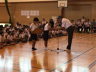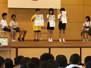 | ☆6月16日(金) 〇6月の児童集会がありました ・児童会が運営するのが「児童集会」、職員の話があるのが「全校集会」です。 ・今日は、ハートフル委員会の発表と運営委員会からのお知らせがありました。 【ハートフル委員会の発表;寸劇の様子】 ・ある学級の朝自習の一コマ。友だちから注意されたら…、どう反応しますか。 【ハートフル委員会からのメッセージ】 ・友だちからの注意は、素直に聞けるといいですね。 ・相手の気持ちを考えて行動すると、みんな笑顔になります。 【運営委員会からのお知らせ】 ◆代表委員会で決まったこと ・学級の旗を作るとき全学年共通で入れた方がいいものは…①集合写真など②クラスの目標③クラス全員の名前 ・雨の日、みんなで遊べる遊びは…①この先生はだれでしょうゲーム②じゃんけん列車→雨の日外で遊べない日の昼休みに、運営委員会が校内放送で呼びかけます。 〇全校表彰もありました 【子ども自転車大会 3位の表彰おめでとう!】 【6年生7名が出場しました】 〇植柳小あれこれカメラ 【先生、見て見て!】 ・休み時間、1年生の男の子たちが「ねえ、先生!」と、声をかけてきました。 ・牛乳パックのリサイクル虫かご?から出てきたのは、トカゲとヤモリ。 ・素早い小動物を上手に捕まえていました。植柳小のモンスターハンターくんですね。 【桜の木にいるのは?わかるかな?】 ・放課後、部活動をしていると、プールの方から「ジーーー」という鳴き声がしました。 ・「もしや?」と思い、近づくと、ニイニイゼミでした。 ・「来週からプールだね」という、蝉からの夏のお知らせでした。 |