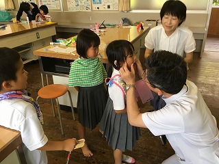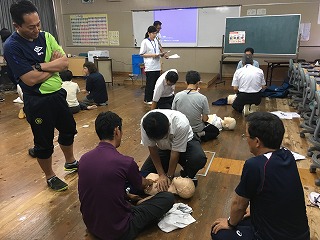 | ☆6月17日(土) 〇歯の健康教室がありました(1年生) ・校医の高田歯科の先生が来校され、歯の磨き方や歯の大切さについての授業がありました。 【高田先生(右)と教育実習の先生】 【磨き残しがないか染め出しをしました】 【再度磨いて、高田先生にチェックしてもらいました】 【しっかり磨いてきれいになりました】 〇校内研修がありました ・来週から水泳の授業が始まります。もしものことに供え、救命救急講習を行いました。 【心肺蘇生の練習の様子】 ・溺れた子どもを発見した場面を想定し、胸骨圧迫やAED(練習用)を使いました。 【エピペンの使い方の講習】 ・食物アレルギーによるアナフィラキシーに対する緊急補助治療医薬品(エピペン)の使い方の講習もしました。 |