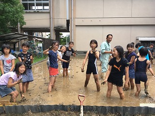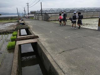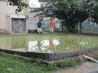 | ☆7月1日(土) 〇5年生が田植えをしました2 ・6月30日(金)5,6時間目に学校で田植えをしました。 【講師はJAの指導員の方】 ・5年生40名で、「よろしくお願いします!」 【田植えスタート!】 ・初めて田植えをする児童もいました。転ばないよう慎重に… 【JAのお兄さん2名が紐を張ってくれました】 【田植えをする子と順番を待つ子】 ・縦横を揃えて、きれいに田植えをしました。 【担任の先生も一緒に田植え】 ・みんな真剣です。 【田んぼの中は子どもたちでいっぱいでした】 ・田んぼの面積は、縦横10mくらいです。算数で習った1アール(1a)ですね。人口密度は、40名÷100㎡で…1㎡あたり何人でしょう? 【大雨の日でしたが、奇跡的に晴れてくれました】 ・この日は、突然の豪雨が数回あり、田植えが危ぶまれました。5年生の気持ちが天に届き?、無事田植えができました。 【もうすぐ終了。田植えは約1時間くらいでした】 ・2時から始め、3時頃に終わりました。 【JAの指導員の方の最終チェック】 ・暑くてお忙しい中、今年も田植えの準備やご指導をしてくださり、ありがとうございました。 【5年生みんなで記念写真】 ・達成感に溢れる5年です。みんなで力を合わせて頑張りましたね。 ・米はもち米です。収穫後は、餅つきをする予定です。これから、水の管理や草取りなど、頑張っていきましょう。 |