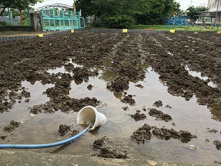 | ☆6月30日(金) 〇5年生が田植えをしました ・JAの方に指導していただきながら、田植えをしました。 【ピンと張った糸に沿って苗を植えました】 【田植え終了。立派な田んぼになりました】 |