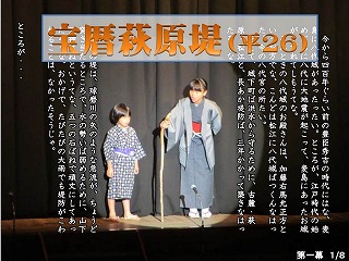 | ☆6月4日(日) 〇「宝暦萩原堤」はこんなお話です ・先日の全校集会で、校長先生が話された「宝暦萩原堤」の内容です。 ・スマホでも見られます。 【平成26年度厚生会館で発表】 ・第一幕→宝暦萩原堤1.pdf ・第二幕→宝暦萩原堤2.pdf ・第三幕→宝暦萩原堤3.pdf |