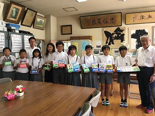 | ☆6月5日(月) 〇「明るい社会づくり運動八代協議会」より図書の本を寄贈していただきました ・毎年八代市郡の小学校へ図書の本を寄贈されておられ、今年で11年目だそうです。 ・会長の渡辺様より18冊の本をいただきました。 【校長室にて】 ・図書委員長さんが受け取りました。大切に読みます。 【図書委員の子どもたち】 ・毎日図書の貸し出しなどの仕事を頑張っています。 【西日本読書感想画コンクール指定図書です】 ・全学年で読書感想画に取り組みます。 ・いただいた本を読んで、素敵な感想画が描けるといいですね。 |