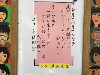 | ☆6月11日(日) 〇今月(6月)の言葉 ・紹介が遅くなりました。今月の言葉です。 ・職員玄関と児童玄関にある移動式ボードに掲示中です。 【6年担任廣岡先生が選んだ言葉です】 ・大原櫻子さん(歌手21歳)の歌「瞳」の歌詞の一部です。 ・『♪涙だって 笑顔だって がむしゃらになった証だよ そんな君と一緒に生きること 僕は誇りに思うよ』 ・2014年度の第93回全国高等学校選手権大会のテーマソングでした。 |