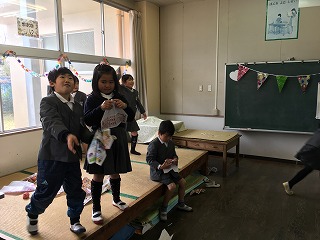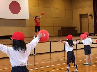 ・初めはうまくできなかった子も、ていねいに教えていただき、2個のお手玉で遊べるようになりました。