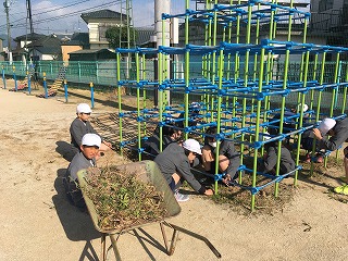・1,2年生は外庭のごみ拾い、3,4年生は校舎内や玄関の掃除、5年生が体育館で会場作りをしました。