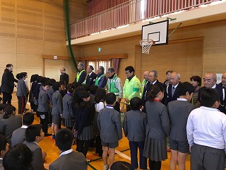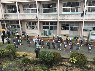 【中庭;5年生と職員でお見送り】