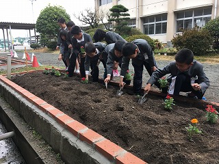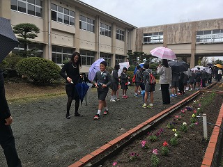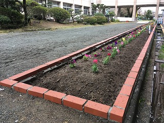 ・あさっては卒業式です。卒業生は、この花だんの横を通って植柳小を後にします。