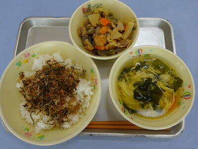 麦ご飯、大根と豚肉の味噌煮、かき玉汁、手作りふりかけ、牛乳(570kcal)