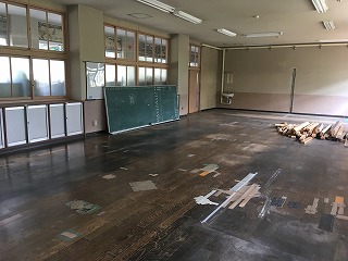 | ☆7月27日(木) その③ ○職員室の床改修が始まりました ・本格的な工事が今日から始まりました。 【更衣室の壁が取り払われました】 ・右奥が男子、左奥が女子更衣室でした。手前の資材は取り払った柱と壁です。 【改修工事1日目の様子】 ・とても暑い中、作業されていました。きれいになる職員室が楽しみです。 |