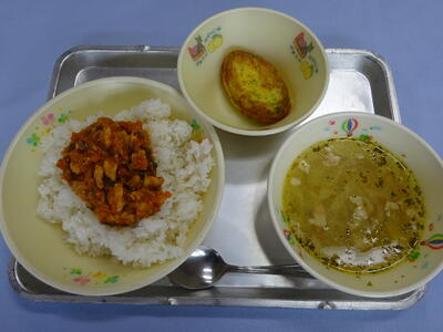 麦ご飯、セルフチキンライス、ほうれん草オムレツ、野菜スープ、牛乳(612kcal)