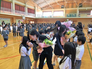 | ☆平成30年3月28日(水) 〇退任式がありました ・今年度は、7名の先生が転出、退職しました。 【転出される先生の話】 【児童代表お別れの言葉】 【花束を贈りました】 【校歌斉唱】 【転出・退職される先生の退場】 ・♪「ありがとう」(いきものがかり)のBGMの中、各学年のアーチを作ってお別れしました。 【涙のお別れ】 【ハイタッチでお別れ】 【教室でお別れ】 ★植柳小を離れられる先生方、今までありがとうございました。新しい地でも、ご活躍なさってください。 〇植柳小サクラだより⑨(3月28日水曜日撮影) ・今日の桜です。 【白鳥の池;桜の花びら】 ・桜の満開も終わり、多くの桜が散り始めました。 〇昼食会をしました(職員) ・職員同士のお別れ昼食会をしました。 【お別れ昼食会;いずかしの森にて】 ・お別れする先生との思い出を、「卒業証書」という形にして、一人ずつ渡しました。 【いただきます!】 ・いずかしの森の桜はだいぶ散っていましたが、春の日差しの中、職員全員で会食しました。 【七学年部】 ・植柳小の竹林で採れた、初タケノコを食べました。 【低学年部】 【中学年部】 【高学年部】 ★職員みんなそろって会食するのも最後となりました。楽しいひとときを過ごしました。 |