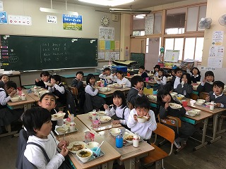 【1年1組の給食の様子】 ・肉そぼろをごはんにかけて、まぜて、食べました。 |