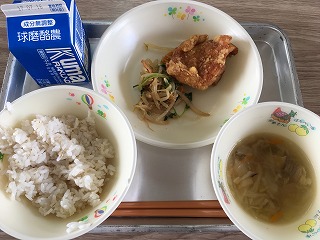 | ☆7月10日(月) 《献立》 ★麦島小4年1組リクエスト給食 ・麦ごはん、春雨スープ、鶏の唐揚げ、デザート(今日はありませんでした)、牛乳 《献立ひとくちメモ》 ・今日は、麦島生姜校4年1組のリクエスト給食です。豆苗は、エンドウ豆の若葉の部分を収穫したもので、中国から伝えられたと言われています。食物せんいやビタミン、ミネラルなどの栄養素が、バランスよく含まれていた、和え物のほか、炒め物やスープ、鍋料理などに使われています。 【ニンニクが食欲をそそる鶏の唐揚げでした】 |