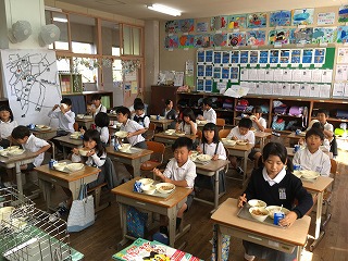 | ☆11月9日金曜日 《献立》 ・麦ごはん、マーボー春雨、野菜のナムル、ショウロンポウ、牛乳 《献立ひとくちメモ》 ・春雨は、緑豆やじゃがいも、さつまいものデンプンから作られる乾麺です。半透明で細長い形状が、春にしとしとと降る雨を連想させることから、春雨と名付けられたそうです。スープやサラダなどいろいろな料理に使われます。今日は、歯ごたえがある緑豆春雨を、マーボー豆腐の味付けにしています。 【2年1組の給食の様子】 ・マーボー春雨は、そのまま、ごはんにかけて、好きな食べ方で食べていました。おいしかったですね。 |