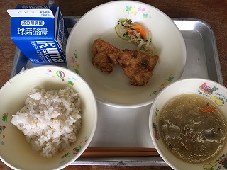 | ☆9月25日(月) 《献立》 ・麦ごはん、ユーリンチー、野菜のナムル、春雨スープ、牛乳 《献立ひとくちメモ》 ・ユーリンチーは、揚げた鶏肉に甘酢ねぎソースをかけた中華料理です。「ユー」が油、「リン」がかける、「チー」が鶏肉を意味します。もともと、大鍋で、鶏を丸ごと油をかけながら、料理していたことから、この名前がつきました。給食では、鶏の唐揚げにに刻んだ長ネギ入りの甘い酢醤油をかけています。 【中華料理の「ユーリンチー」】 |