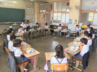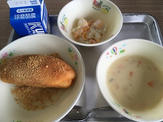 | ☆10月22日月曜日 《献立》 ★植柳小2年2組リクエスト給食 ・きな粉揚げパン、クリームシチュー、ヨーグルトあえ、牛乳 《献立ひとくちメモ》 ・シチューとは、野菜や肉、または魚介類などをだし汁やソースで長時間煮込んだ西洋料理のことです。具が大きく、どろっとしたとろみがあるものをシチューというのに対し、具が小さくソースのとろみが少ないものは、チャウダーと呼ばれます。 【1年1組の給食の様子】 ・きな粉揚げパンは、子供たちに大人気のメニューです。シチューやヨーグルトあえが好きな子も多く、残菜はほとんどゼロな日でした。 |