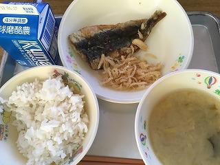 ・麦ごはん、みそ汁、魚のかば焼き、たくさんのごまいため、牛乳
