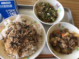 | ☆9月29日(金) 《献立》 ・麦ごはん、肉じゃが、手作りふりかけ、切り干し大根の酢の物、牛乳 《献立ひとくちメモ》 ・切り干し大根は、江戸時代からの代表的な干し物で、日本一の産地である宮崎県では、毎年11月下旬から2月にかけて、畑に干すための棚がずらりと並び、その景色は冬の風物詩となっています。長期保存ができ、調理も簡単な切り干し大根は、カルシウム、ビタミンB、C、、Dを多く含む便利な食材です。 【9月最後の給食でした】 |