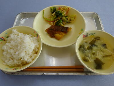 麦ご飯、ブロッコリーのごま和え、魚のみぞれソース、味噌汁、牛乳(542kcal)