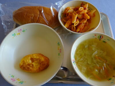 ミルクパン、冬トマトのベンネ、オムレツ、野菜スープ、牛乳(552kcal)