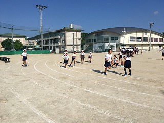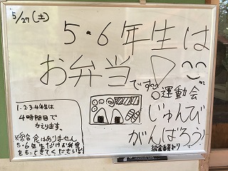 | ☆5月27日(土) ○運動会の準備があります 【5月26日(金)朝の時間;リレーの練習をする5年生】 ・4時間目、全校で運動会の準備をします。 ・1~4年生は4時間授業、5,6年生はお弁当を食べて午後も運動会の準備です。みんな頑張りましょう。 |