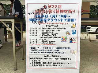 | ☆8月15日(火) ○ふるさと祭りが行われました ・8月14日(月)植柳小グラウンドで「第32回ふるさと祭り植柳盆踊り」が行われました。 【ふるさと祭りの様子】 ・危ぶまれた天候でしたが、雨が降ることもなく、多くの人で賑わいました。 【プログラム】 【午後4時から準備をしました】 ・提灯と電球の取り付けをしています。 【出店の準備の様子】 ・今年度は運動場の奥に出店が並びました。 【盆踊りの様子】 ・伝統の盆踊り。盆踊り保存会や地域の方が一緒に踊り、初盆の方や先祖の供養をしました。 |