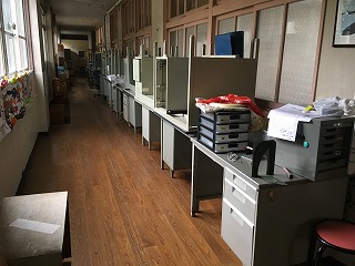 | ☆8月22日(火) ○職員室の床改修工事が終わりました 【床板がきれいになりました】 【職員室横に置いている机など】 ・8月29日(火)が職員室への引っ越しです。 ・机や棚などを運び入れます。それまではパソコン室が仮の職員室です。ご用の方はパソコン室まで。 |