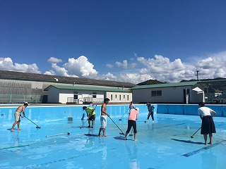 | ☆8月23日(水) ○校内研修とプール掃除をしました ・毎週水曜日は校内研修があります。 ・午前9時から12時過ぎまで、人権教育や情報教育、伝統文化教育などの研修を行いました。 【伝統文化教育の研修】 ・低学年、中学年、高学年に分かれて、カリキュラムデザインについて話し合いました。 【プール掃除】 ・プールの水が濁っていたため、排水し、プールの掃除をしました。 ・午後2時から3時まで、体育主任を中心に職員10名ほどできれいにしました。 |