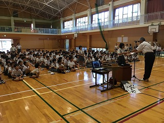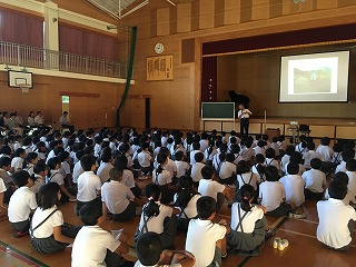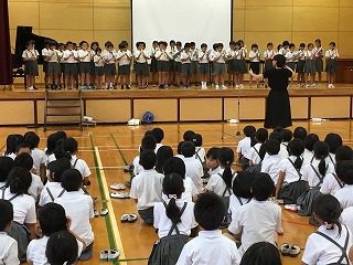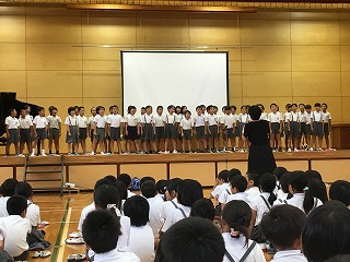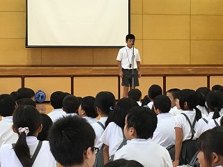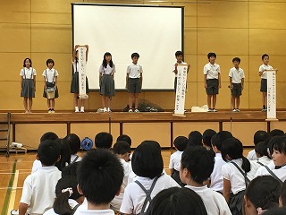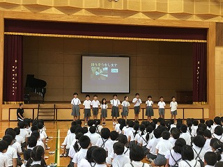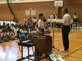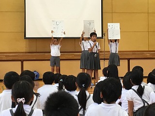 | ☆9月15日(金) ○9月の児童集会がありました 【情報委員会の発表】 ・情報委員会の活動の紹介とお知らせがありました。 ・「給食時間にリクエスト曲を流します。CDを募集します!」 ・児童数の減少により、放送委員会+掲示委員会=情報委員会になりました。 【環境委員会】 ・環境ISOのことや校内リサイクル活動などについて発表しました。 【ハートフル委員会】 ・相手のことを思いやること…その一つにトイレのスリッパ並べがあります。全校でトイレのスリッパ並べを頑張りましょう。 【運営委員会】 ・代表委員会で決まったことのお知らせがありました。 ・掃除の合い言葉は、「お・す・し」です。 ★八代市音楽会に出場した4年生の発表もありました。 【斉唱「夢びより】 【合奏「チキチキバンバン」】 ・例年、1学期の終業式に発表するのですが、今年は体育館の耐震工事でできませんでした。そこで今日の発表になりました。 ・元気のより歌声とリズミカルな合奏が素敵でした。 |