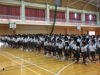 | ☆9月1日(金) ○2学期がスタートしました ・新しく改修をした体育館で、2学期の始業式をしました。 ★始業式 【校長先生のお話】 ・夏休みの失敗談をもとに話をされました。 【2学期の言葉;「いい準備」】 ・「2学期は『いい準備』をしましょう。いい準備とは心がまえ、物の確認、体つくりです。『いい準備』をして、学校生活をおくりましょう。」 【元気に校歌斉唱】 ★表彰(夏休みの頑張り) 【八代市童話発表会】 ・6年の平松君が最優秀賞を受賞しました。10月に県大会へ出場します。がんばってください! 【ミニバスケットボール大会で優勝!】 ・チームワークを生かして見事優勝。おめでとう。 【バドミントン大会で表彰】 ・6年生と4年生のペアで頑張りました。 ★大そうじ 【1年1組教室のそうじ】 ・自分たちの教室をきれいにしました。 【児童玄関のそうじ】 ・隅々まできれいにしていました。 ★学活 【2年1組の様子】 ・宿題や通知表の提出、新しい教科書の配布、2学期の勉強の話などありました。 【午前中授業で下校】 ・明日からまたお休みです。月曜日、元気に会いましょう。 |