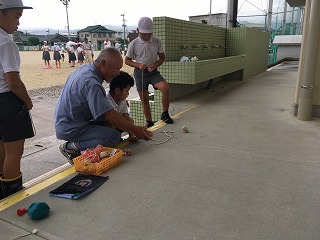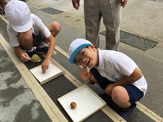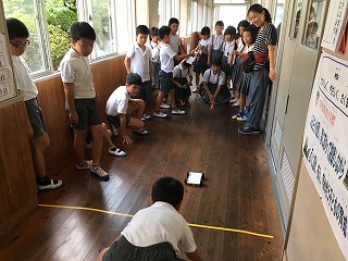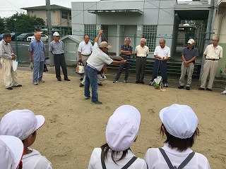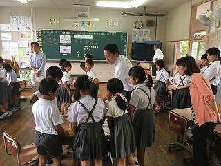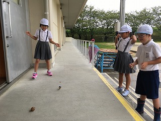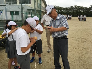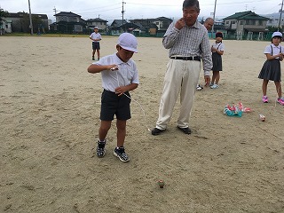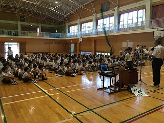 | ☆9月5日(火) ○こま回しを楽しみました(3年) ・植柳校区の住民自治会の方12名が来校され、3年生と一緒にこま回しをしました。 【こま回しの様子】 ・3年生の国語の学習『こまを楽しむ』の発展的な学習として取り組みました。 【住民自治会の皆さま】 ・2度の延期があり、3回目にしてやっとできました。 【ちょんかけ駒を披露されました】 ・「すごい!すごい!」と、子どもたちの大歓声があがりました。 【こま回しを教えてもらう3年生】 ・全くやったことがない児童がほとんどでした。手取り足取り教えてもらいました。 【体育館通路でもこま回し】 ・小雨で運動場の地面が柔らかく、コンクリートの上でもチャレンジしてみました。 【初めてこま回しができた女の子】 ・うまく回せて、とても嬉しいようでした。二人の女の子は、コツをつかみ、何度も続けて回していました。 【ひもをつかわない「逆さごま」】 【児童代表お礼の言葉】 ・3年生を代表して、お礼の言葉を言いました。 ★当初は1学期にする予定だったのですが、雨、また雨、2学期になっても雨…、と雨続きの「こま回し体験」でした。今日は何とかできて本当に良かったです。 ★何度も延期になりながら、学校へ来て教えてくださった住民自治会の皆様に感謝です。 ★木を切り出して、手作りのこまを作ってきてくださった方もいました。「植柳愛」を嬉しく感じた「こま回し体験」でした。 |