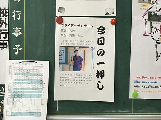 | ☆9月2日(土) ○今月(9月)の言葉 【職員玄関にある今月の言葉】 ・「『名前で呼ぶ』その小さな心遣いが人を目覚めさせ生きる喜びを引き出す」 ・渡辺和子さん(1927年2月11日~2016年12月30日 (89歳)、キリスト教カトリック修道女、学校法人ノートルダム清心学園理事長。北海道旭川市生まれ) ○始業式の朝あれこれ ・始業式の朝の様子です。 【南門;朝の交通指導】 ・防犯協会の方が2名、校長先生、職員3名で、交通指導をしました。 【運動場;朝の時間の様子】 ・5年生の男子たちがサッカーをしていました。久しぶりに会う友だちもいて、楽しそうでした。 【南門の掲示板;9月バージョン】 |