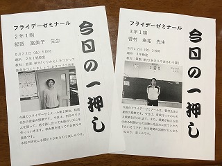 | ☆9月8日(金) ○第1回フライデーゼミナール ・教師の授業改善、子どもたちの学力向上をめざし、「フライデーゼミナール」を始めました。 【6年生算数;少人数クラスの様子】 ・トップバッターは、少人数クラス担当の松村先生。「拡大と縮小」の授業をしました。 【「フライデーゼミナール」の案内ポスター】 ・フライデーゼミナールとは、教師の自主的な研究授業です。お互いの授業を見合い、授業力向上に努めます。金曜日に行うので「フライデーゼミナール」です。 【6年生児童の様子…少人数クラス19名】 ・算数の授業は、より学力を充実させるため、クラスを半分に分け、担任が6年教室で、少人数担当が算数教室で授業します。 【発表する児童】 ・子どもたちがお互いに学び合う姿が見られた授業でした。 【校長室;授業研究会(放課後)】 ・研究授業もですが、授業研究会も自主的な参加です。今日の授業について、意見を出し合いました。 ・植柳小の全員が授業をします。「一人の百歩より、全員の一歩」で頑張っていきます。 |