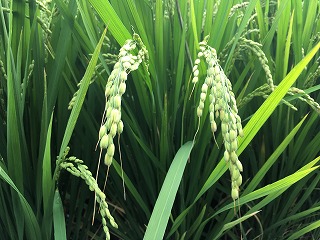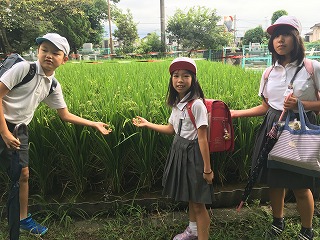 | ☆9月18日(月・祝) ○稲が大きくなりました ・5年生が育てている学校田の稲が大きくなりました。 【80㎝くらいの高さ】 【先日は5年生が草取りをしました】 【実もついてきました】 |