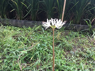 | ☆9月24日(日) ○スズメ除けのキラキラテープ ・稲の実が大きくなり、スズメが食べないように、キラキラテープを張り巡らせました。 【お米を育てている5年生】 ・写真ではわかりにくいですが、稲の上に赤と銀のキラキラテープがあります。 【先週より実が膨らんでいます】 【田んぼの横に一凛の白い彼岸花】 |