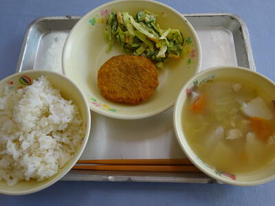 麦ご飯、米粉だご汁、ちくワンサラダ、うまかコロッケ、牛乳(542kcal)