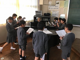 ・ピアノの周りに集まり、先生と一緒に歌の練習に取り組んでいました。