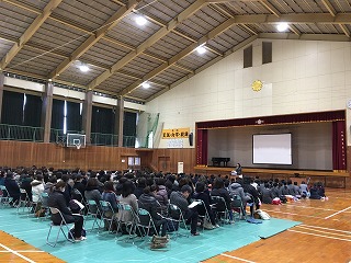 | ☆平成30年2月8(木) ・三中の体育館で、入学説明会がありました。本校の6年生児童と保護者、担任が参加しました。 【三中の体育館;三中の校長先生の話】 【中学校について;生徒会が説明】 ・生徒会の水本くん(植柳小の卒業生)が説明してくれました。 み…みんな仲のいい ず…ずっと仲のいい も…もっと仲のいい と…ともだちをつくろう! 【部活動紹介】 ・部活動紹介でも、植柳小の先輩がキャプテンとして、部の紹介をしてくれました。 ・どの部に入ろうか、楽しみですね。 【植柳小みんなで、はい、チーズ!】 ・実は、三中校区に転入してくる友達も2名います。文政小と大分県の友達です。 ・すっかり仲良くなり、一緒に写真に写りました。気軽に声をかけ、男女関係なく、誰とでも仲良くできるのが植柳小6年生のよさです。お互いに楽しい中学校生活が送れるといいですね。 |
