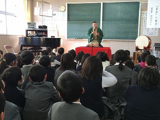 | ☆平成30年2月9日(金) ・全校で、伝統文化の「落語」を聞きました。 【音楽室;講師は、桂伸三さん】 ・両親が八代市出身の「桂伸三(しんざ)さん」の落語を聞きました。 【低学年と高学年の2部構成でした】 【低学年の部;太鼓をたたく体験】 ・落語の始まりと終わりには、太鼓の音がします。 ・「お客様、大勢いらしてください」との願いを込めて打つそうです。 ・お客が帰るときは「デテケ、デテケ(出てけ、出てけ)」と打つそうで、音が言葉につながっていることを知りました。 【低学年の部】 ・「牛ほめ」「寿限無」の2つのお話を聞きました。子どもたちは大笑いでした。 【高学年の部】 ・「時そば」「転失気」など3つのお話を聞きました。高学年も、大笑いでした。 【低学年の部;質問コーナー】 ・「(児童)たくさんお話をして、喉はいたくならないのですか?」「(桂さん)のど飴やはちみつをなめたりして、喉は大切にしています。」 【テレビ局の取材もありました】 ・「NHK」と「彦一テレビ」のカメラマンが取材に来ていました。 【お礼の言葉】 ・「お話がおもしろくて、たくさん笑いました。今日はありがとうございました。」 ・本物の落語を聞くことで、日本の伝統文化のよさが改めて実感できた講演会でした。 ★桂伸三さんは、「自分の故郷は八代市だ」と言われていて、これまで何度も八代で寄席を開かれています。これからも、東京から八代へ来て、寄席を行われるそうです。機会があればぜひ足を運んでみてください。 |
