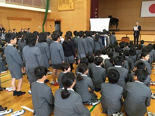 | ☆平成30年3月8日(木) ・学習コミュニティーの閘先生が来校され、卒業式の歌唱指導をしてくださいました。 【体育館;5,6年生へ歌唱指導】 【熱心に歌う子どもたち】 ・6年生が2曲「旅立ちの日に」「すてきな自分と出会う道」、5年生が1曲「大空が迎える朝」、5,6年生合同で1曲「さようなら」を歌います。 【すべての曲を子どもたちが伴奏します】 ・5年の米田さん、6年の前田さん、山本さん、よろしくお願いします。 〇明日の遠足!天気は大丈夫かな? ・心配な天気ですが、2年生がかわいい「てるてる坊主」を作ってくれました。 【2年2組のドアにあるてるてる坊主さん】 【職員室にある巨大てるてる坊主】 ・明日晴れるように、校長先生にプレゼントしたてるてる坊主です。 【午後3時過ぎの空】 ・てるてる坊主の効果が表れたのか、放課後、ちょっと晴れ間が見られました。 【笑顔で下校する6年生】 ・明日の「お別れ遠足」、晴れるといいですね。 〇木曜日はあいさつ運動です ・今週も、あいさつ運動を頑張りました。 【正門横であいさつ運動】 ・ハートフル委員会の子どもたちです。 【南門であいさつ運動】 ・運営委員会の子どもたちです。 ・雨の日は特に気をつけて、子どもたちの登校の様子を見守っています。 |