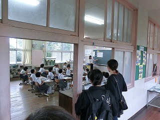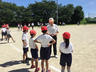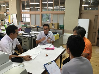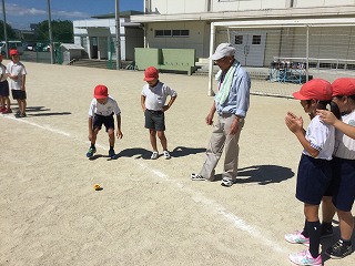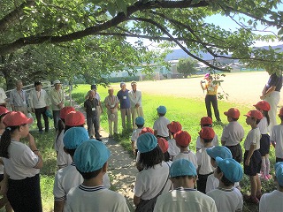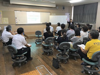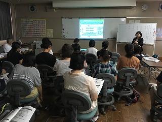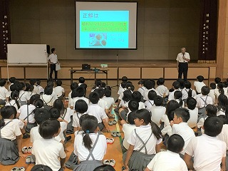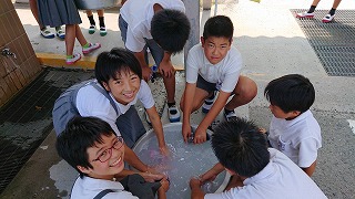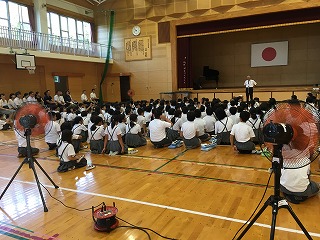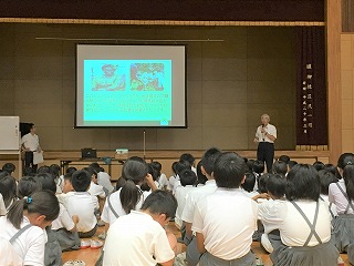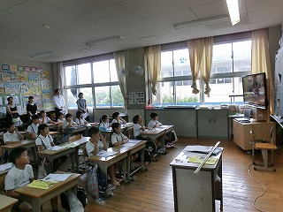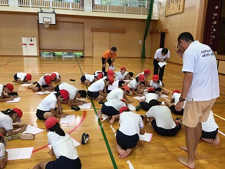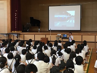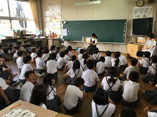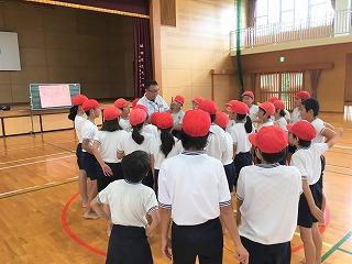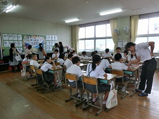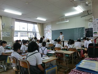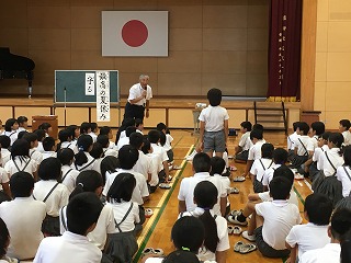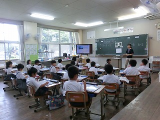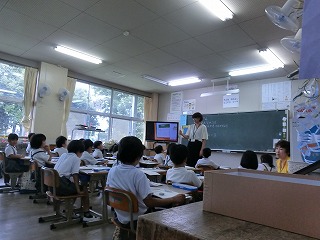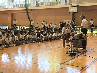 | ☆平成30年7月11日(水) ・2時間目、運動場で「こま回し体験学習」がありました。総合的な学習の時間に、日本の伝統的な遊びをしました。 【桜の木の下であいさつ】 ・30度を超える暑さでした。木陰で、会を始めました。16名の地域サポーターの方々が、こま回しを教えてくださいました。 【サポーター先生に教えてもらう子どもたち】 ・まずは、ひものかけ方から教えてもらいました。みんな真剣に習っています。 【回るこまに歓声!】 ・さすが、サポーターの先生。上手にこまを回されました。すごくて拍手!! 【こま回し体験】 ・みんな暑さも忘れて夢中にこま回しをしました。 【回るかな?えいっ!】 【丁寧に教えてもらいました】 ・1班は子どもたち4人で、1人の先生がついてくださいました。親切丁寧に教えていただき、「初めてできた!」と、喜ぶ子どもがたくさんでした。 【こま回し体験学習;終了】 ・30度を超える猛暑の中、こま回しを教えてくださり、ありがとうございました。 〇今年も水泳指導をお願いします(5、3年生) ・校長先生は体育指導が専門で、今年も水泳指導の補助をしてもらっています。 【5年生;平泳ぎの指導①】 ・手の掻き方を教えてもらいました。 【5年生;平泳ぎの指導②】 ・校長先生の周りに集まって、教えてもらいました。 【3年生;平泳ぎの指導】 ・平泳ぎの足の動きを指導してもらいました。子どもたちは、プールサイドに手を置き、練習しました。 〇特別な教科「道徳」の研修会がありました ・県教育センターより、安武指導主事を講師としてお招きし、「道徳における指導方法の工夫と改善」について研修を行いました。 【パソコン室;第15回校内研修】 【安武指導主事の講話】 |