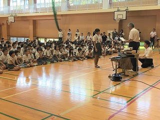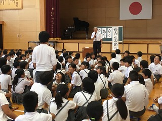 | ☆平成30年7月2日(月) ・文化庁主催の「文化芸術による子供の育成事業」があります。その巡回講演(芸術鑑賞会)が9月3日に行われる予定で、事前の体験型講習(ワークショップ)がありました。 【体育館;3~6年生が参加】 ・「万作の会」から3名の狂言師が来校され、狂言について学びました。 ・狂言は、今から600年ほど前、室町時代に成立した、日本の伝統芸能です。ユネスコの世界無形文化遺産にも登録されています。 【狂言「蝸牛」】 ・山伏と太郎冠者のやりとりがおもしろくて、子供たちが大笑いしていました。 【狂言をやってみよう】 ・音響や映像のない昔は、声と体ですべてを表現しました。子供たちは「柿を食べる」演技をやってみました。 【修行をしました】 ・「よろしくお願いします!」と礼をして、狂言の修行を3つしました。①言葉の稽古、②動きの稽古、③言葉と動きを合体させた稽古です。 【特別の修行もしました】 ・師匠に「大笑い」を教えてもらいました。子供たちは弟子です。 【大笑いをする弟子たち】 ・「わー、はっはっはっはっはっはっ!」と、大きな口を開けて笑いました。 【修行終了の礼】 ・礼をして感謝の気持ちを伝え、師匠と弟子の関係も終わりました。ありがとうございました。 ☆3名の狂言師の方から、日本の伝統芸能である「狂言」の楽しさを教えていただきました。 ☆芸術鑑賞会まであと2ヶ月あります。時々練習して、忘れないようにしようと思います。 ☆本番がとても楽しみになりました。「万作の会」の皆様、ありがとうございました。 |